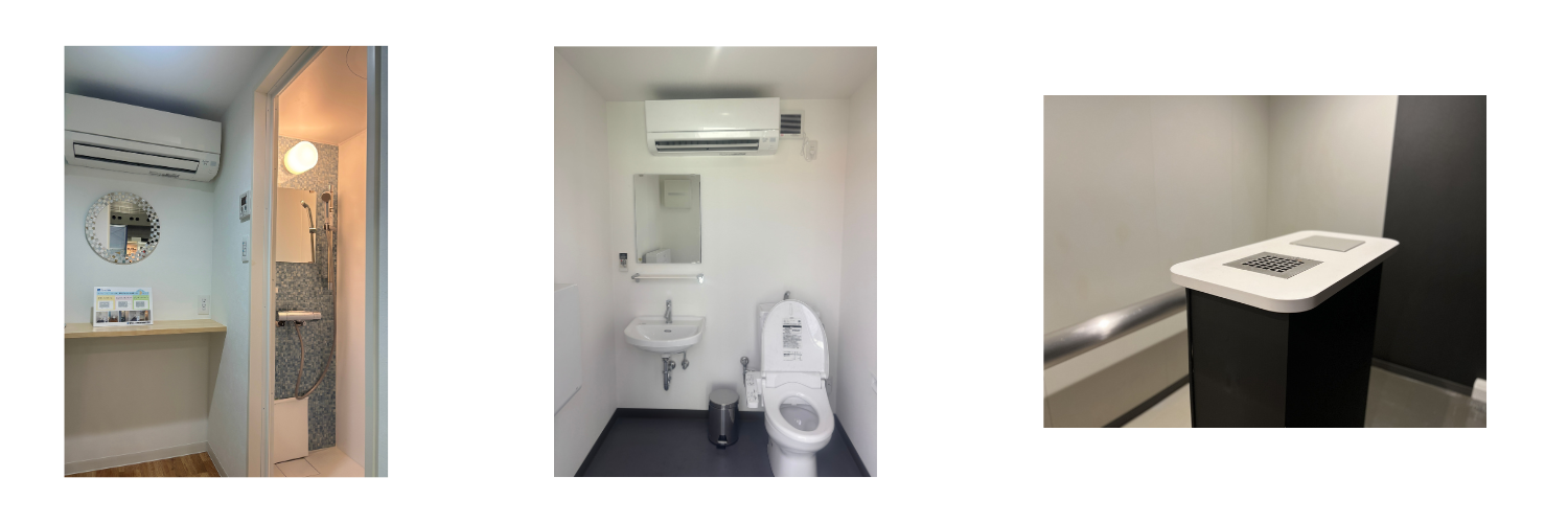給排水設備を組み込むことで、簡易シャワールームとして短期間利用にも対応できます。
